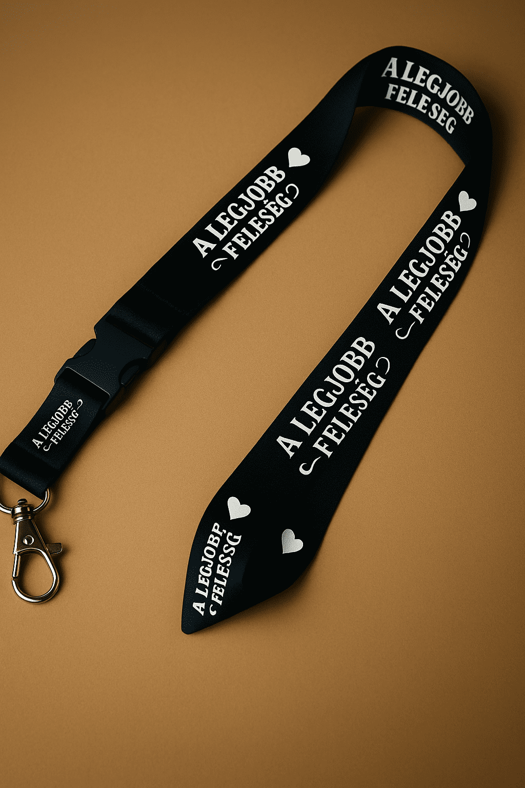 Stílusos „Legjobb Feleség” feliratú nyakpánt, praktikus karabinerrel, kulcsok, belépőkártyák vagy telefon rögzítéséhez.