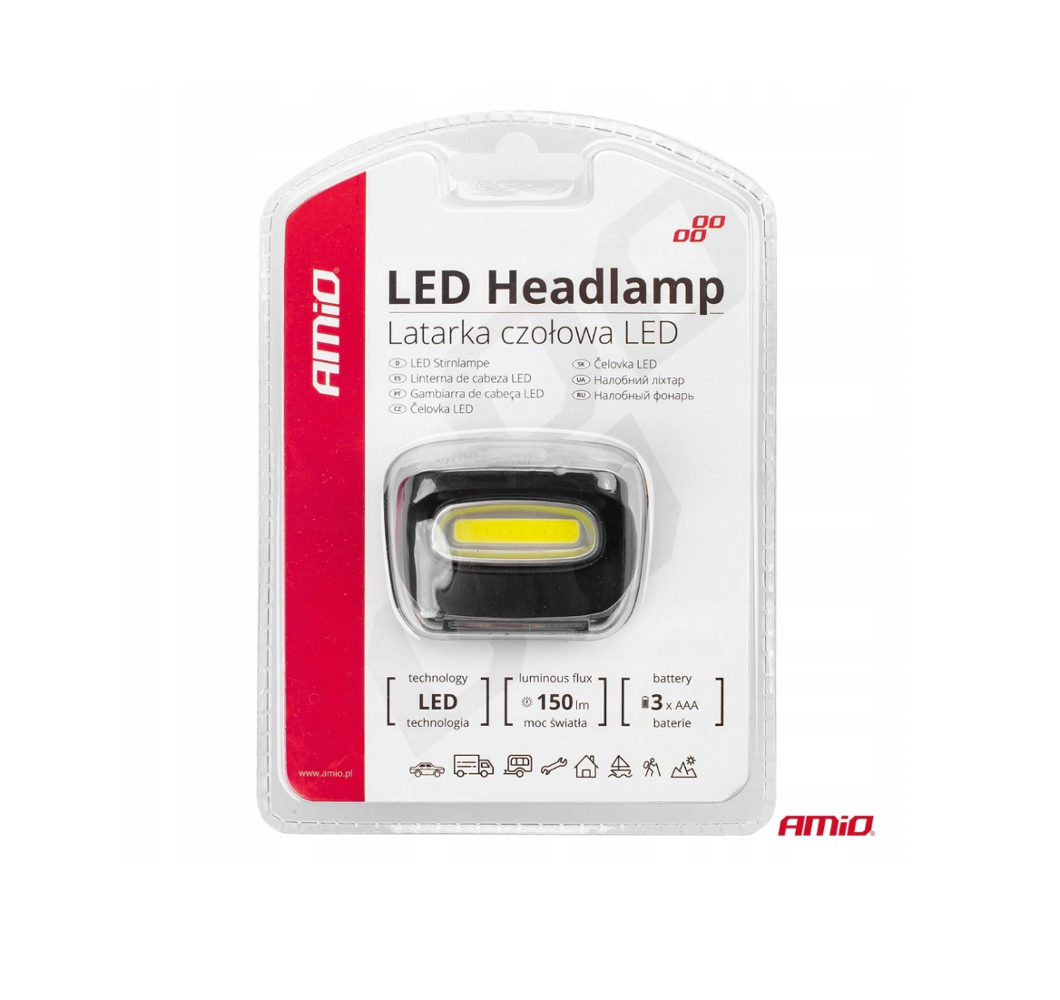 COB Fejlámpa 150 Lumen – AMiO 3×AAA, IPX3, Állítható, Könnyű Kivitel