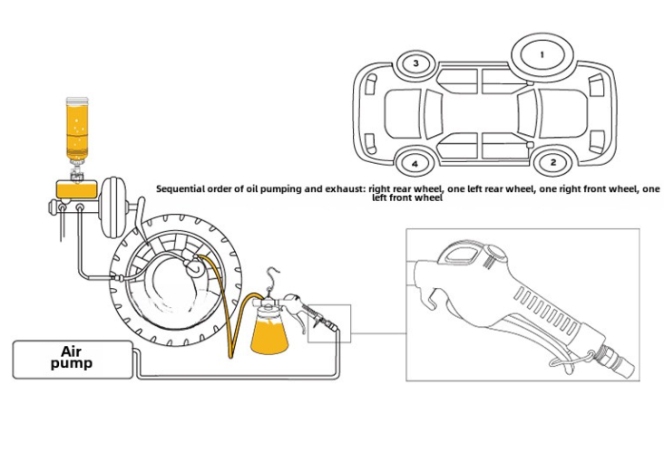 3️⃣ Csatlakoztasd a sűrített levegőt a pumpához, és szívd ki a régi olajat a féknyergeknél